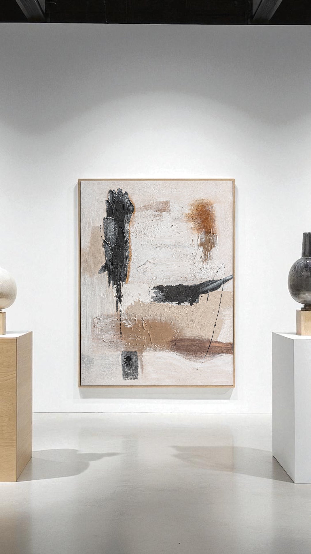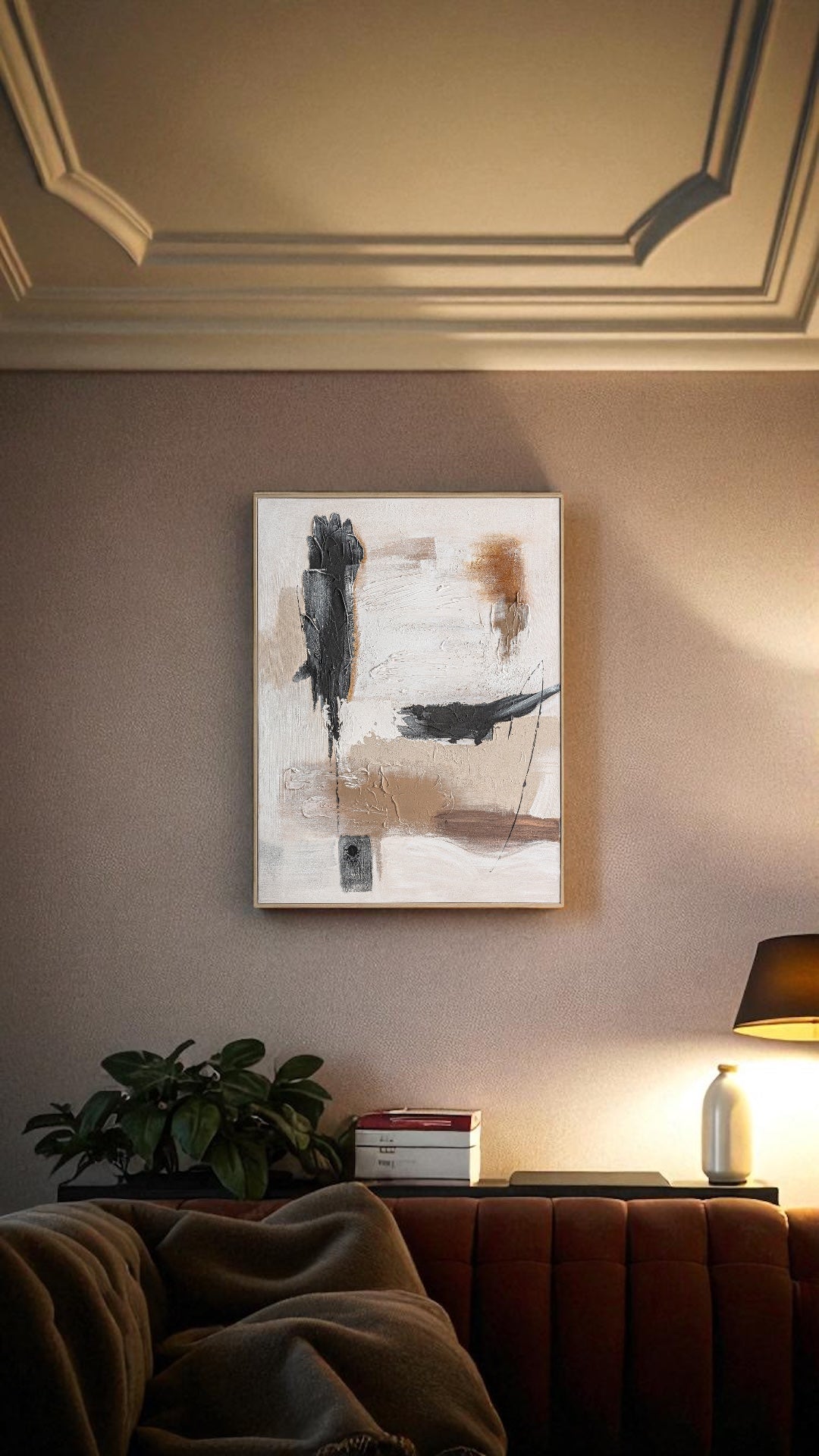 Un souffle d'abstraction, une toile où les contraste s'entrechoquent: le noir le beige et le blanc dialoguent dans une harmonie mystérieuse. Chaque coup de pinceau semble figer un instant suspendu, entre force et légèreté. Le regard s'attarde, explore les textures, s'interroge sur l' histoire qu'elle murmure. Dans un salon épuré, un bureau moderne ou une chambre apaisée, ce tableau devient plus qu' une décoration: une présence, une source de profondeur qu'attire les regard et apaise l' esprit.