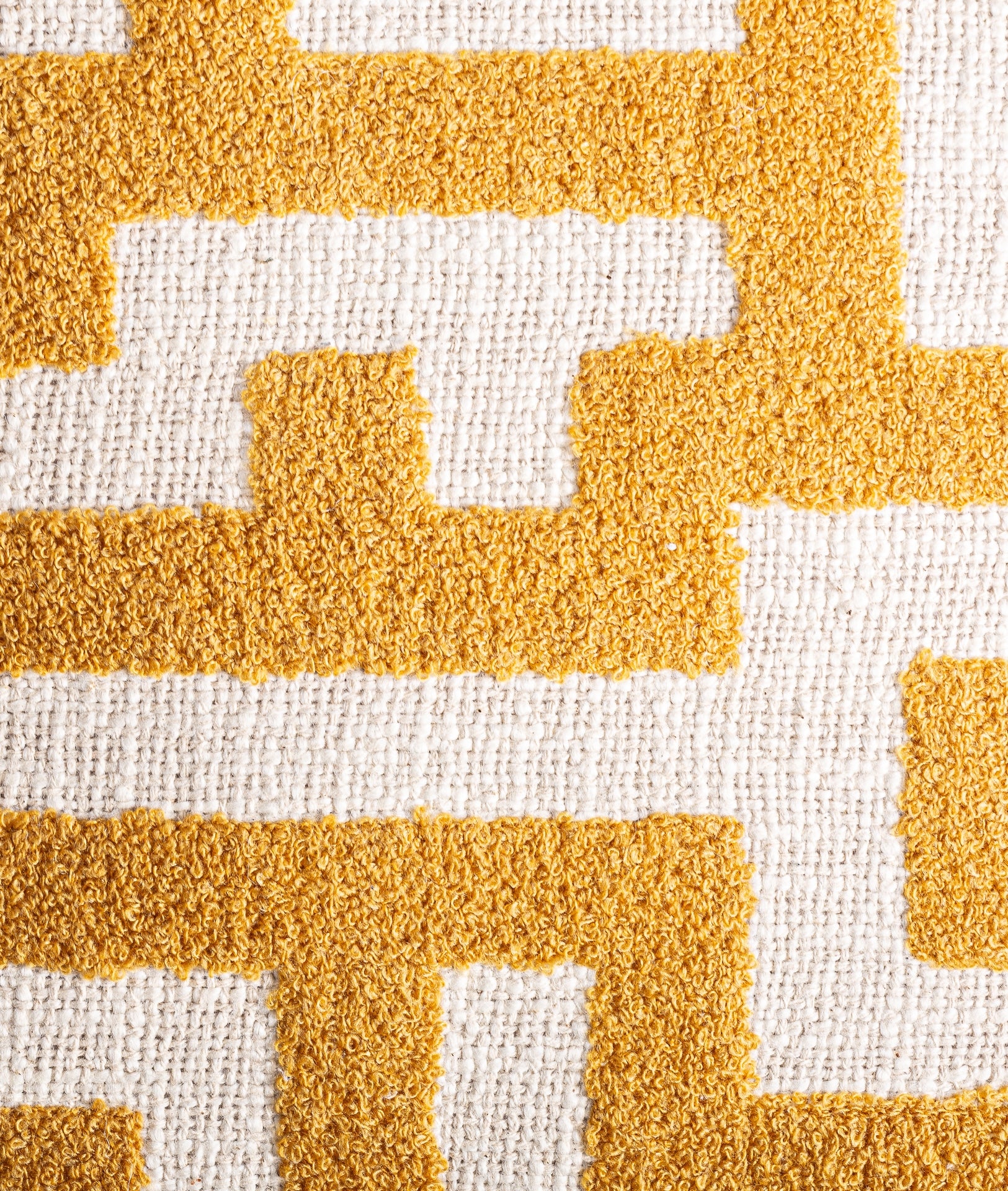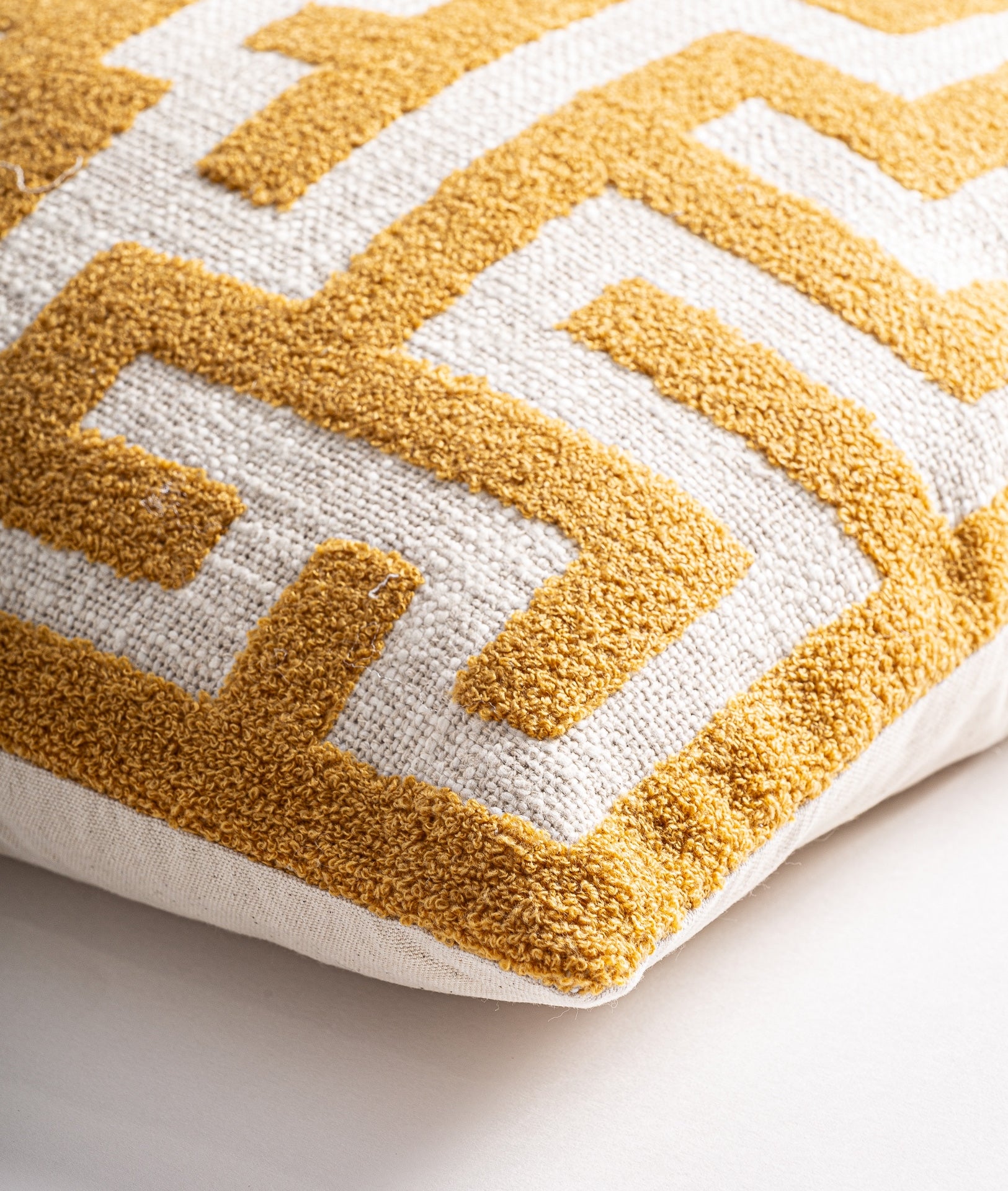 Le coussin Amaia en ocre et beige, allie design géométrique et confort, parfait pour les intérieurs modernes et les projets contract.