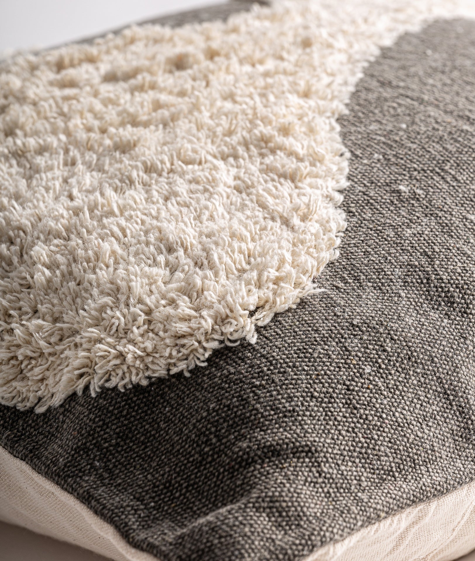 Le coussin Sahun, en blanc cassé avec gris, reflète le naturel et la légèreté, conçu pour les environnements contemporains qui privilégient le confort.