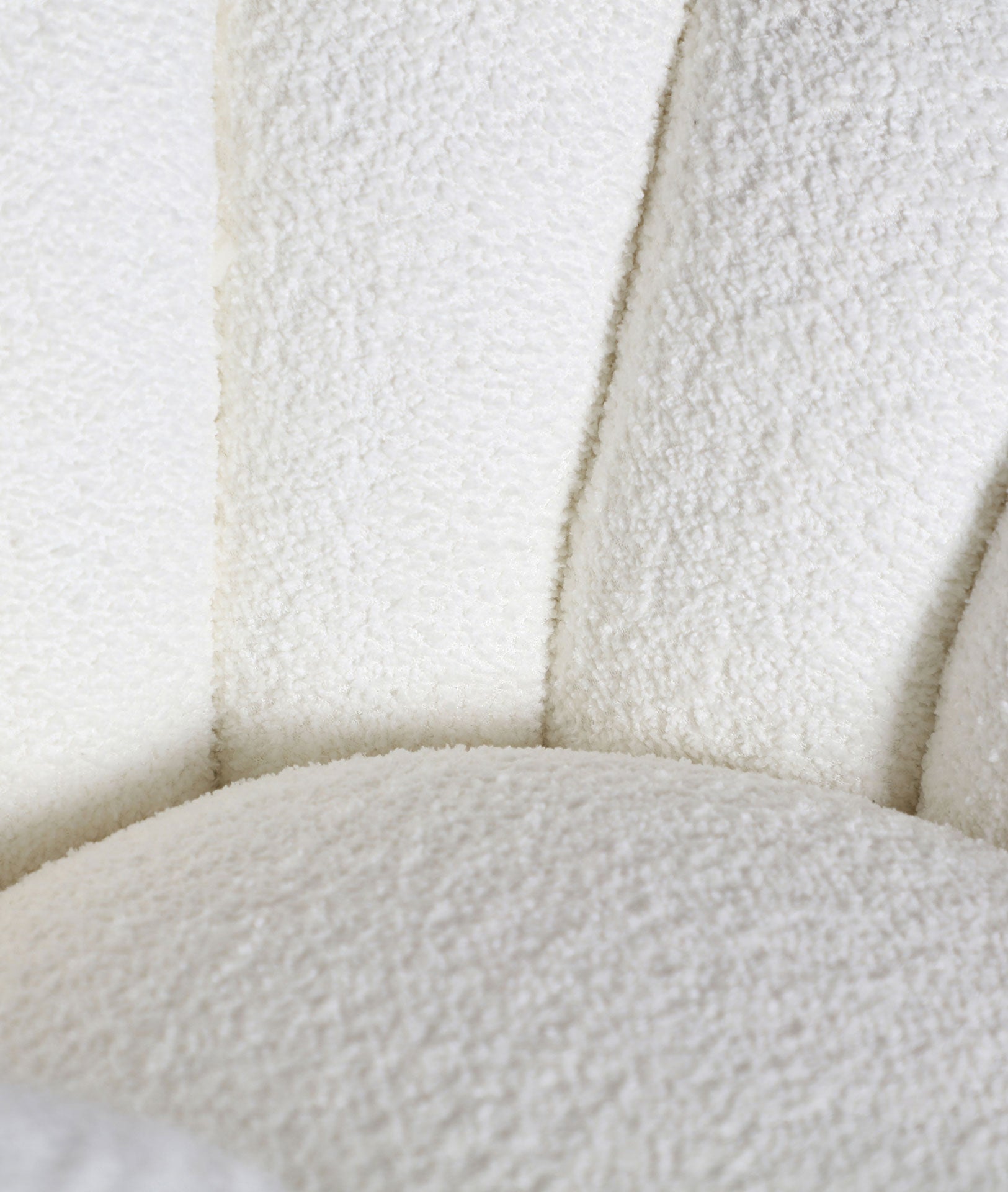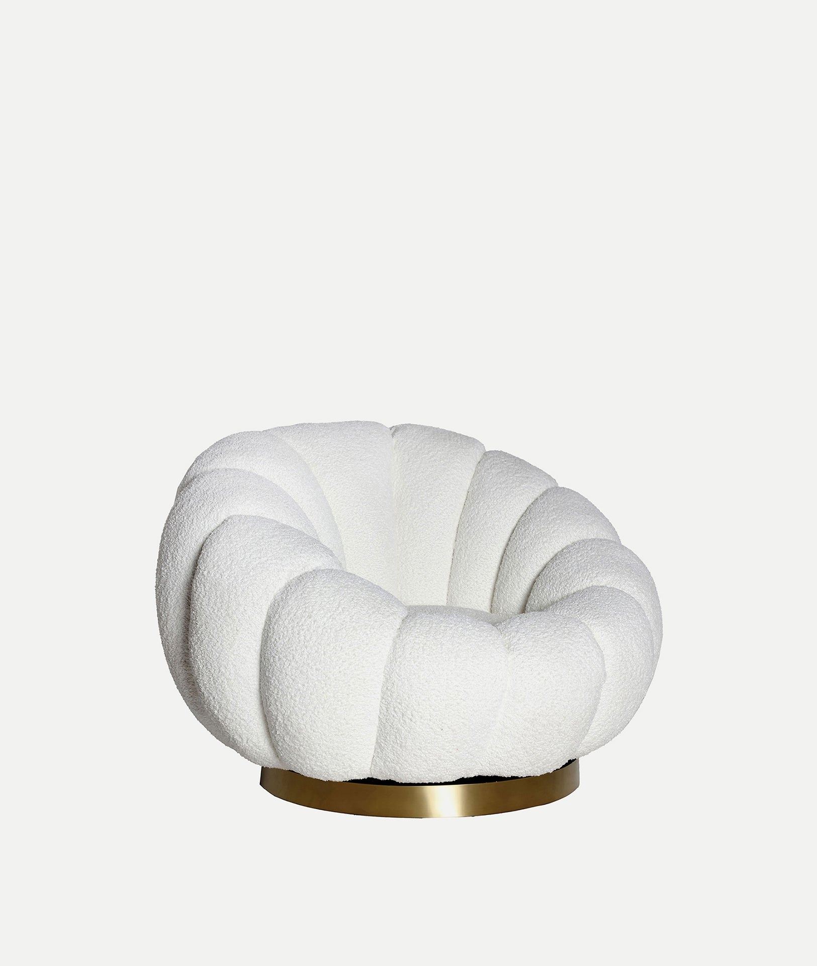 La chaise pivotante Bouclé Crest, en coton bouclé, allie élégance et confort dans un design sophistiqué. Sa finition blanche, rehaussée de détails dorés à la base, ajoute une touche de luxe à n'importe quel espace. Avec une texture douce et bouclée, cette chaise de style art déco est parfaite pour le salon, la salle à manger ou tout autre coin spécial de votre maison. Ses dimensions de 93x90x67cm le rendent idéal pour offrir confort et style. Il deviendra votre siège préféré.