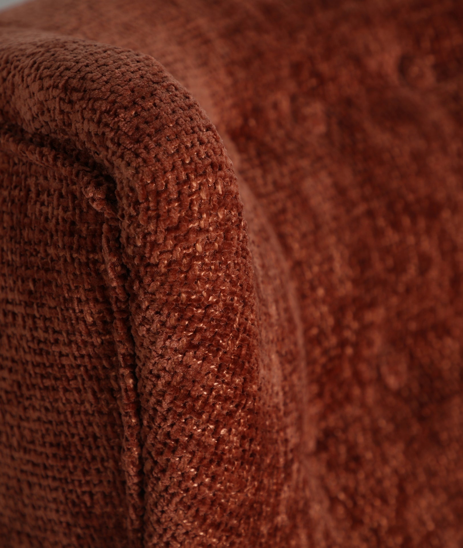 Fauteuil en tissu texturé terracotta, au design enveloppant et pied noirs fuselés