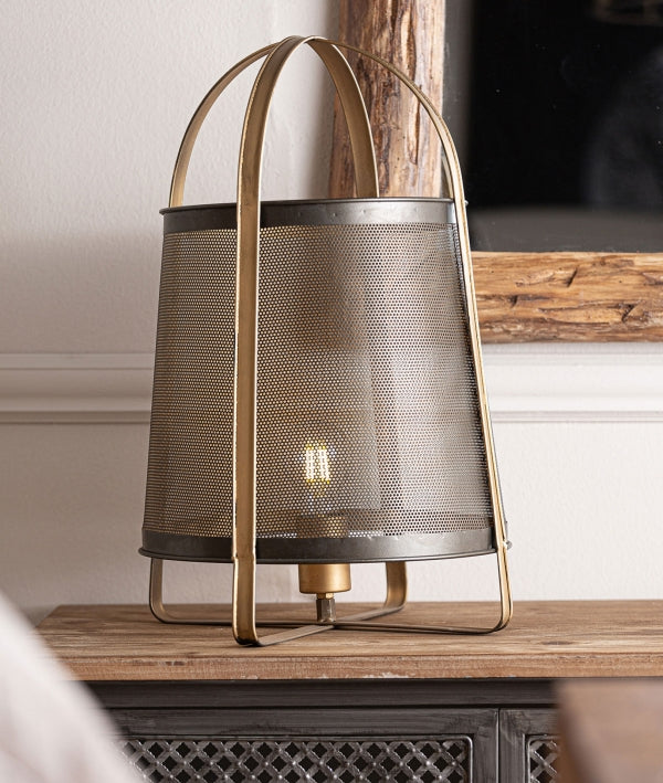 Cette lampe de table, au design inspiré d'une lanterne, est un ajout remarquable aux intérieurs les plus insolites. Entièrement en fer, elle est dotée d'un cadre lisse qui soutient un abat-jour en treillis métallique plaqué or vieilli. Une pièce maîtresse qui ne passera pas inaperçue dans tous les intérieurs.