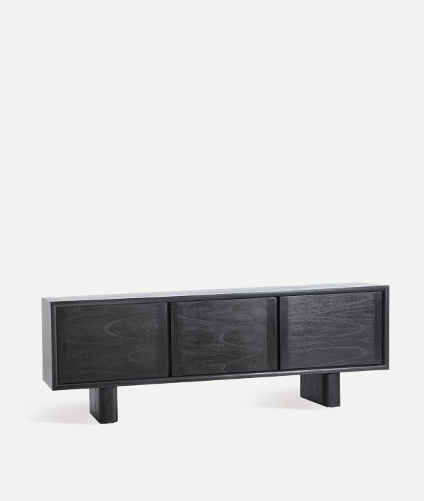 Meuble TV Demmin au style contemporain, en bois de mindi noir. Un meuble simple et élégant alliant fonctionnalité et design minimaliste.