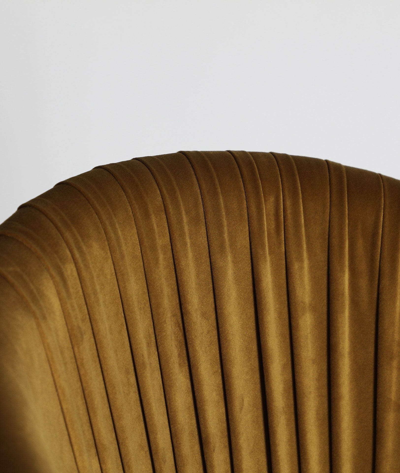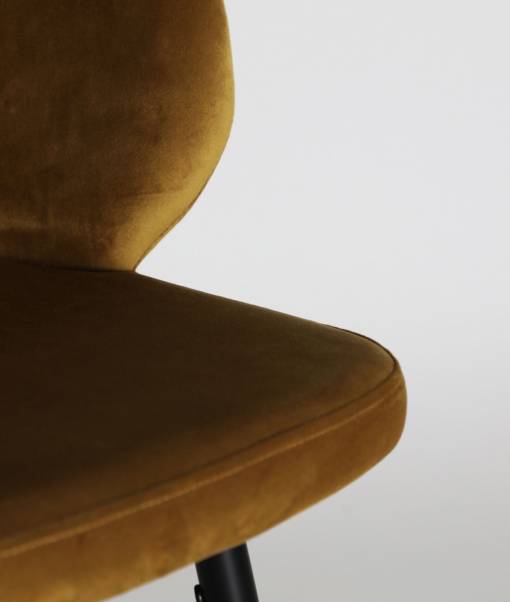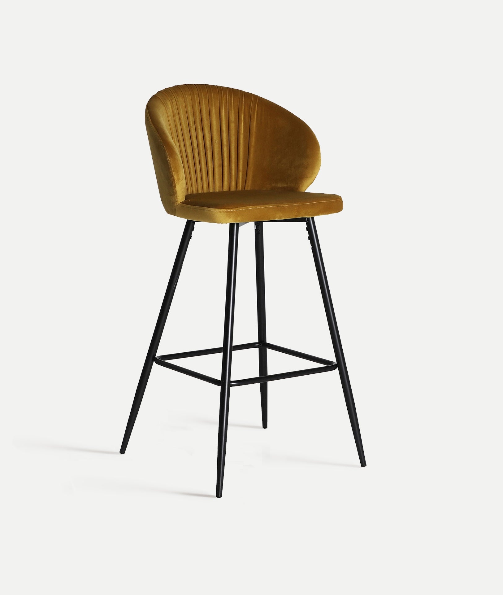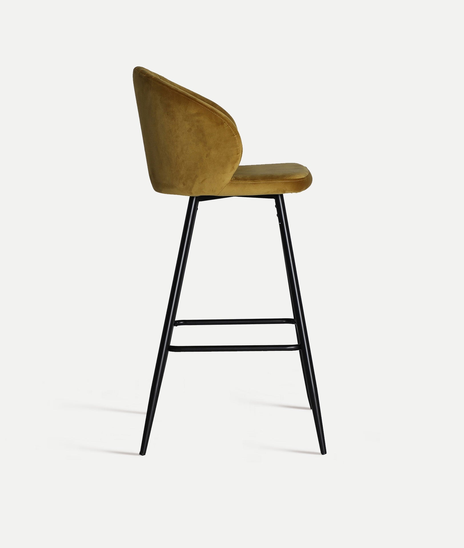 Chaise de bar en velours de couleur ocre et du fer de couleur noire.