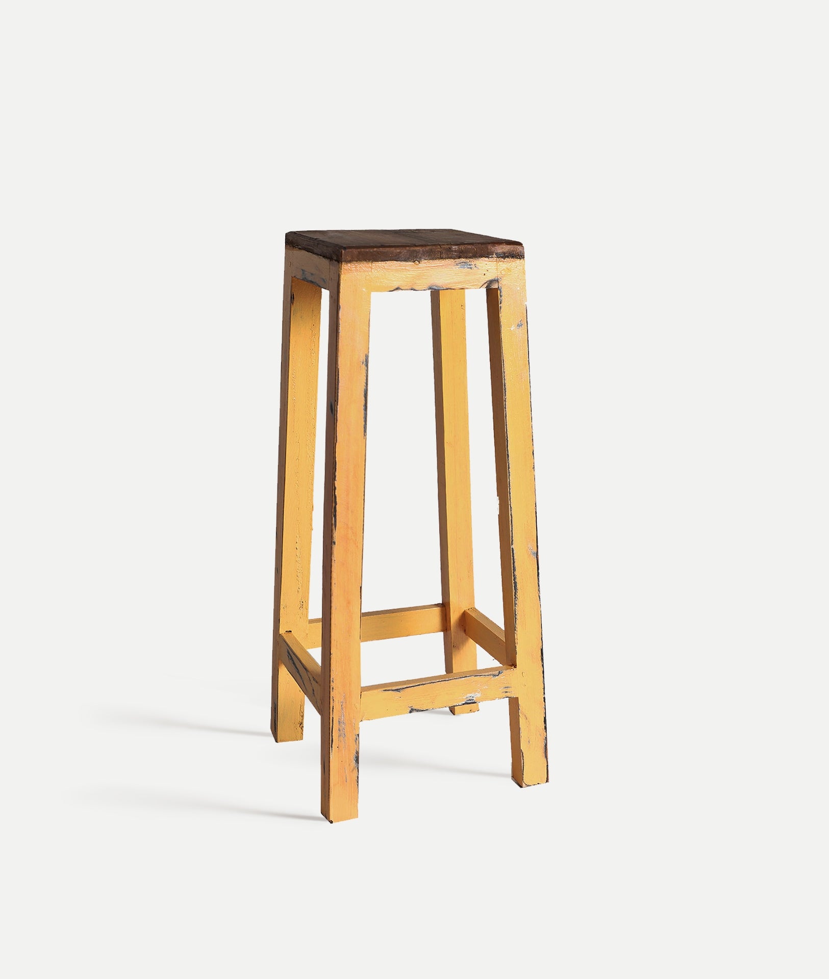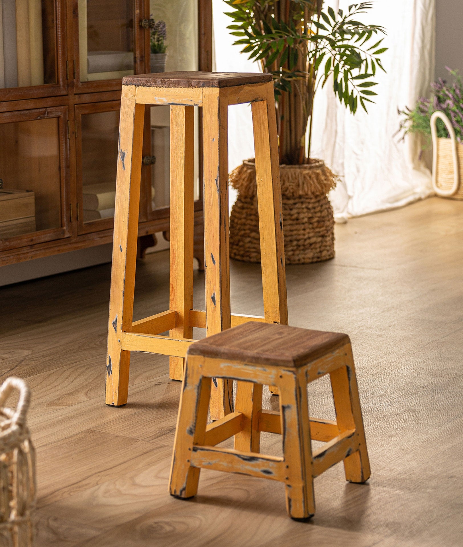 Tabouret de bar en bois d'acajou brun avec une finition vieillie et bois de manguier jaune et du bois de...