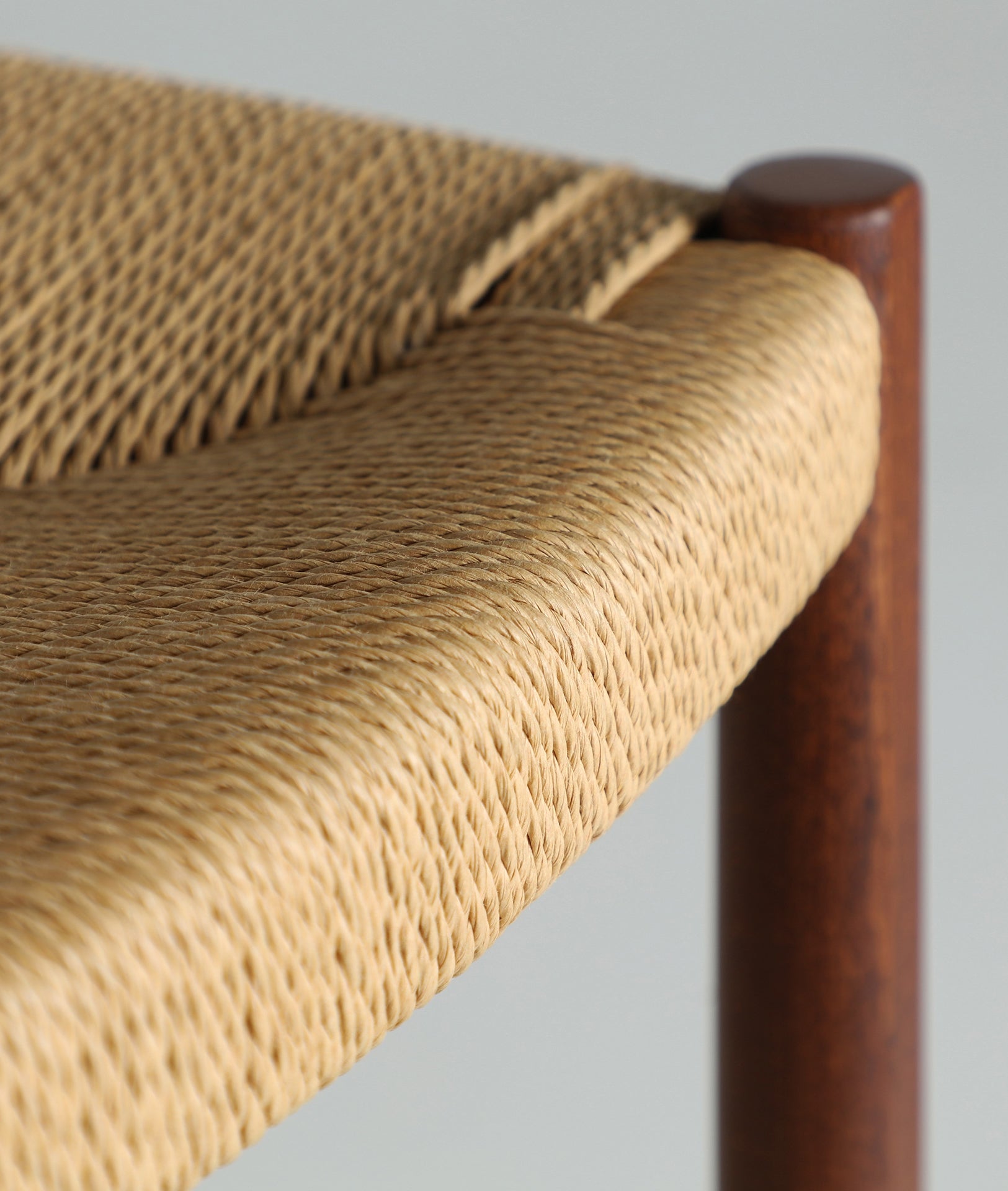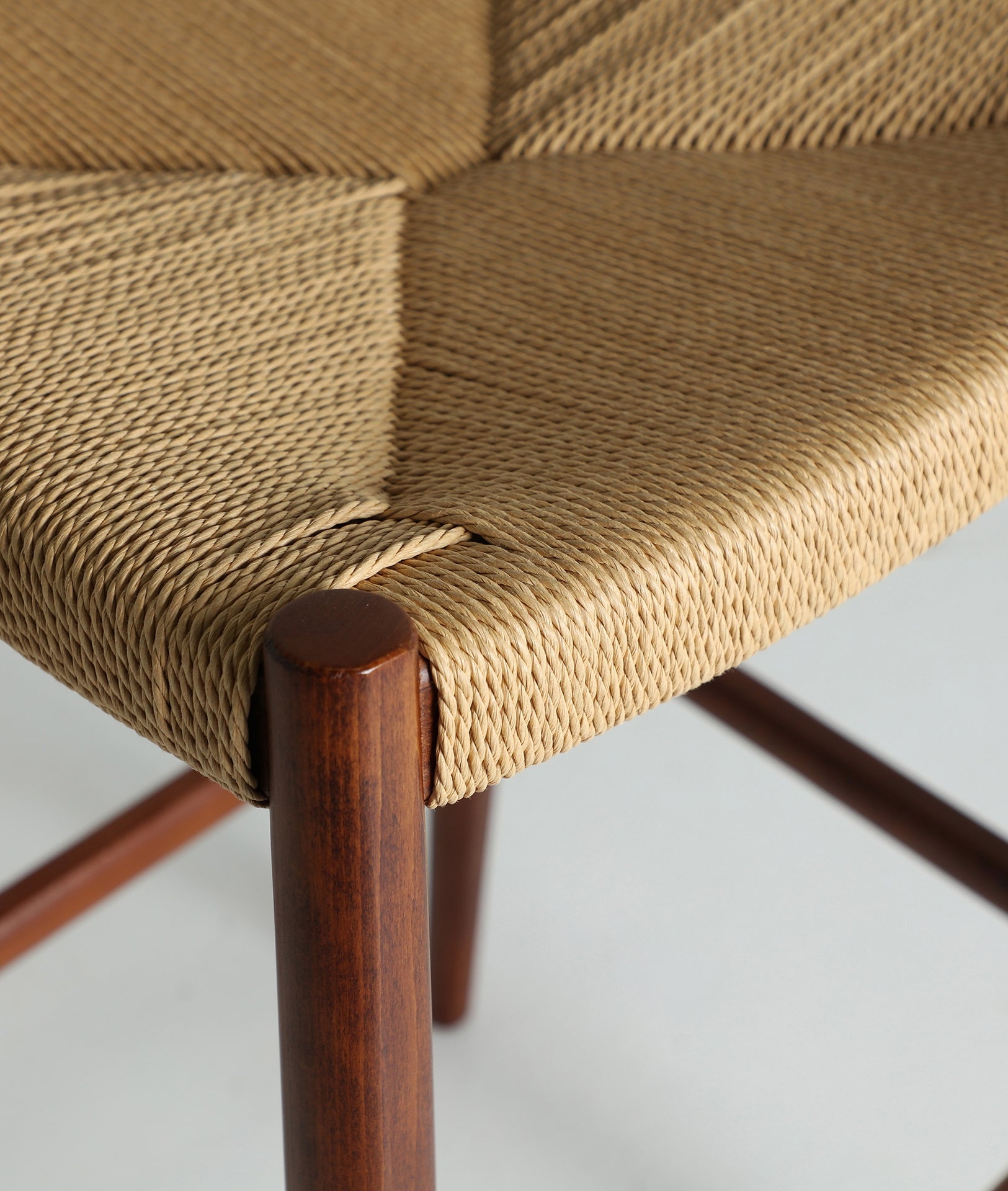 Chaise de bar haute en bois de hêtre brun combiné à de la corde beige.